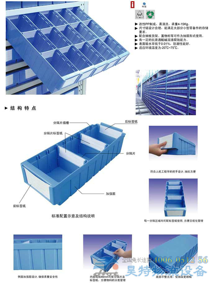 抽屜式零件盒也稱元件盒,適合工廠、辦公室各種小型零件、物料、文具用品等之儲存使用。廣泛用于機械、汽車、家電、輕工、電子等行業(yè),能耐酸耐堿、耐油污,無毒無味,可用于盛放食品,清潔方便,抽屜式零件盒周轉便捷、堆放整齊,便于管理。