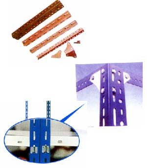 1、貨架立柱:由等邊角鋼雙邊沖孔制成,孔距離以50mm距離沿直線排列,立柱孔用來掛接層板之用;