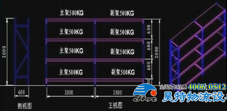 (1)正視圖:貨架層是由橫梁、層板組成,層板可選木質(zhì)層板或鋼制層板;貨架承重設(shè)計(jì)在500KG以內(nèi),層數(shù)常規(guī)四層,可增減;一排貨架,第一個(gè)是主架,后面連接因共同立柱片(即少一立柱片)稱為副架。下圖可見:貨架層板配制加強(qiáng)筋,以加強(qiáng)貨架穩(wěn)固性。