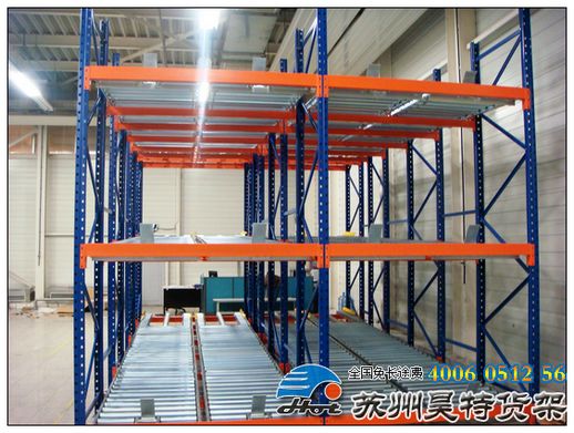 重力式貨架:是一種利用存儲(chǔ)貨物自身重力使貨物運(yùn)動(dòng)的存儲(chǔ)系統(tǒng),較多用于揀選系統(tǒng)中。與流利裝置和輥道配合使用,取傾斜布置。:“先進(jìn)先出”型存儲(chǔ)模式,存貨時(shí)托盤從貨架斜坡高端送入滑道,通過導(dǎo)向輪下滑,逐個(gè)存放;取貨時(shí)從斜坡低端取出貨物,其后的托盤逐一下滑動(dòng)持取。倉(cāng)庫(kù)利用率極高,運(yùn)營(yíng)成本較低,但對(duì)物流布局通道有特殊要求。適用于易損貨物和大批量同品種短時(shí)期存儲(chǔ)的貨物。