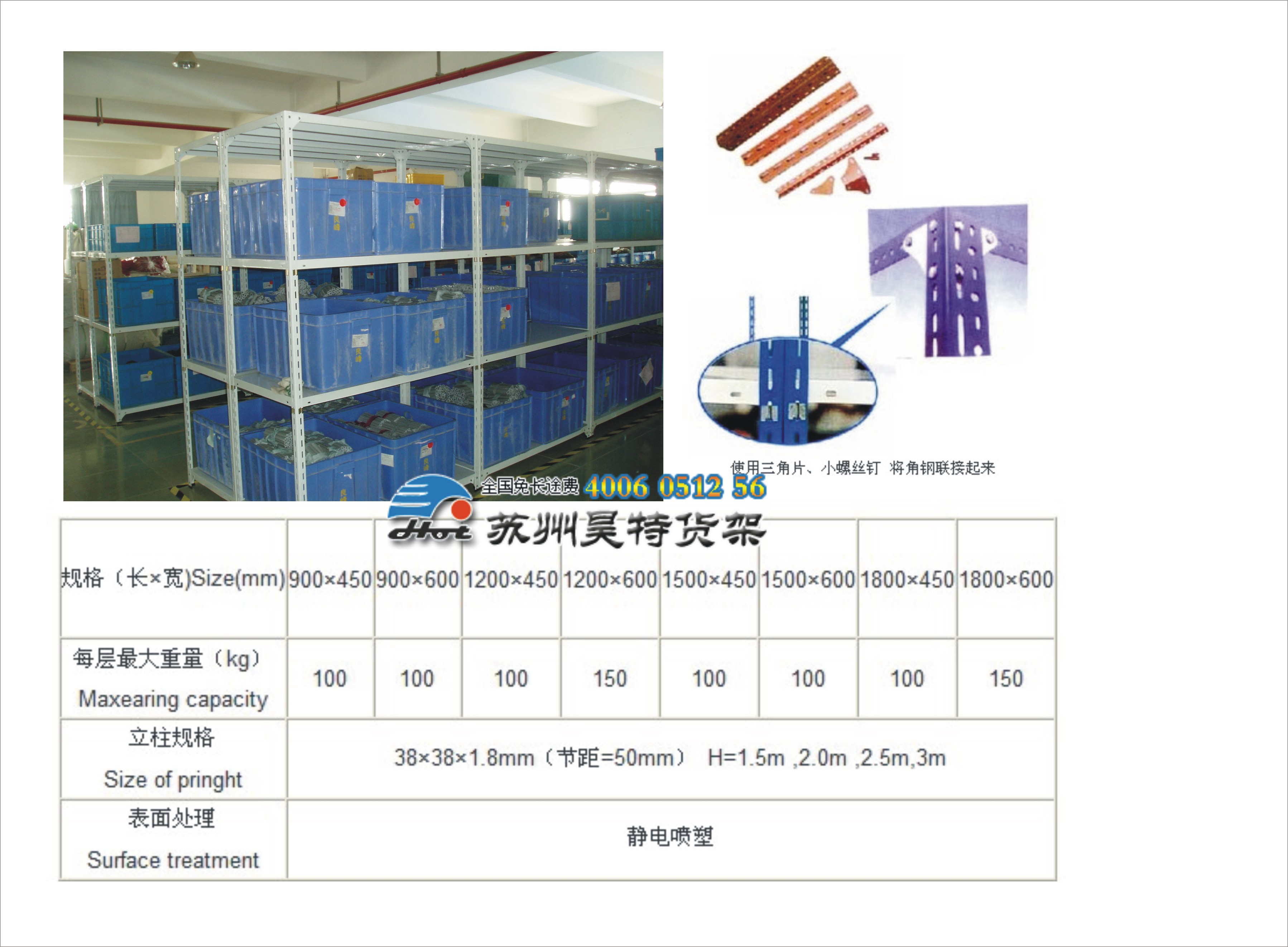 貨架由立柱、層板、角碼、卡銷、專用螺栓和塑料底腳組成。