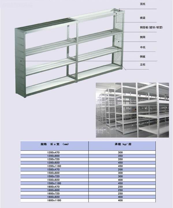 中量A型貨架,中量型貨架,擱板式貨架用途:通常用于中小件、較重貨物存儲(chǔ),單層承重預(yù)設(shè)在150kg-350kg范圍內(nèi)。