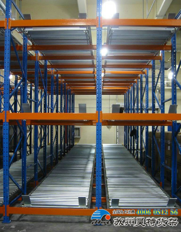 適合先進先出、流量較大的產(chǎn)品。利用滾軸滑動使貨物達到自動存貨流轉(zhuǎn),空間利用率達85%。適合冷庫,物流配送中心等大型倉庫管理使用。普通平衡式叉車可操作。