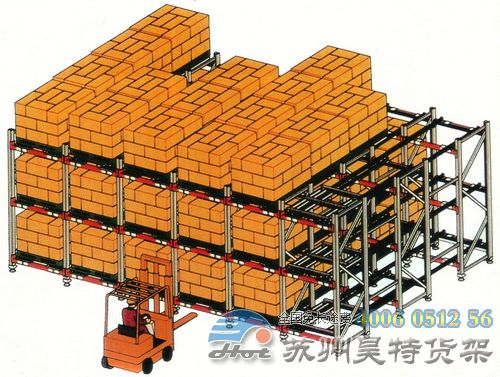 (2)采用軌道和托盤小車相結(jié)合的原理,軌道呈一定的坡度(3°左右),利用貨物的自重,托盤貨物被規(guī)定于單端存儲,貨物先進后出,適用于大批量少品種的貨物存儲,空間利用率很高,存取也較靈活方便。