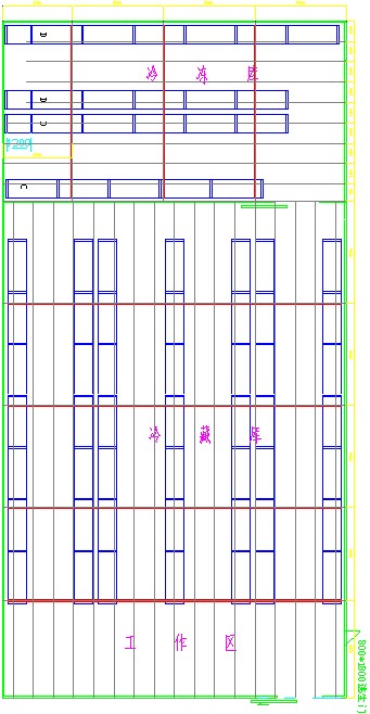 該冷庫冷藏部分約680,冷凍儲藏部分約220,冷庫總面積約為1000,庫內(nèi)高5200mm,內(nèi)部布置貨架,貨架的布置如下圖所示。