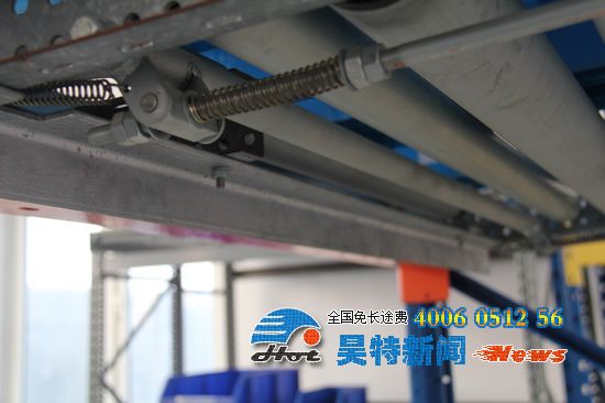 3.當(dāng)滑行到頂端時(shí),托盤(pán)會(huì)將前端的彈片壓下來(lái),同時(shí)后面一個(gè)托盤(pán)位的擋片會(huì)彈出,阻止后面的貨物繼續(xù)向下滑動(dòng)