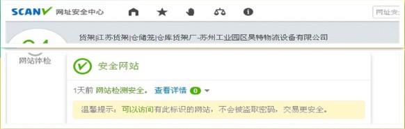 近日,公司主站《蘇州昊特貨架》不僅通過了360綠色網(wǎng)站認(rèn)證,還通過了SCANV認(rèn)證,不僅能夠得到更多客戶的信任和支持,還能展現(xiàn)出公司的企業(yè)實力,務(wù)客戶無論從產(chǎn)品質(zhì)量上還是從上網(wǎng)安全上都做到了細(xì)致入微的保障!