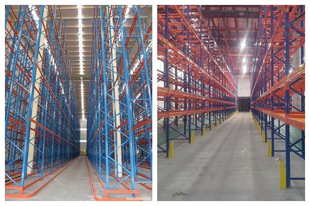 VNA貨架的特點在于空間率用率高,在與普通托盤貨架相比,可提高20%左右,另外通道兩側(cè)設置有導向軌道,為三向叉車起導向。其次,VNA貨架安裝后有高約200MM的導軌(導軌可在土建時做好,也可在安裝貨架時用做好的護板做)做為叉車的引導系統(tǒng),減少叉車司機因人為因素對貨架產(chǎn)生的危險,相對于駛?cè)胧綄λ緳C的要求要低一些。