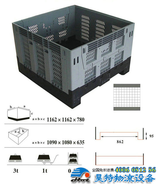 3。折疊式四向進(jìn)叉,外尺寸: 1200×1000×975mm,內(nèi)尺寸: 1110×910×790mm,動載:1噸,靜載4噸,貨架0.8噸。