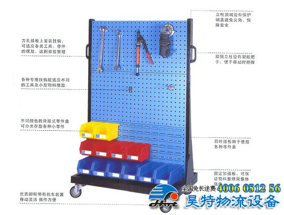 物料整理架物是以方孔掛板和百葉掛板為主要部件,結(jié)合背掛零件盒、掛鉤、棚板等多種配件使用。對您生產(chǎn)現(xiàn)場的小型少量多樣的工具、物料進(jìn)行分類存放、方便搬運歸位、充分利用空間,整潔高效。